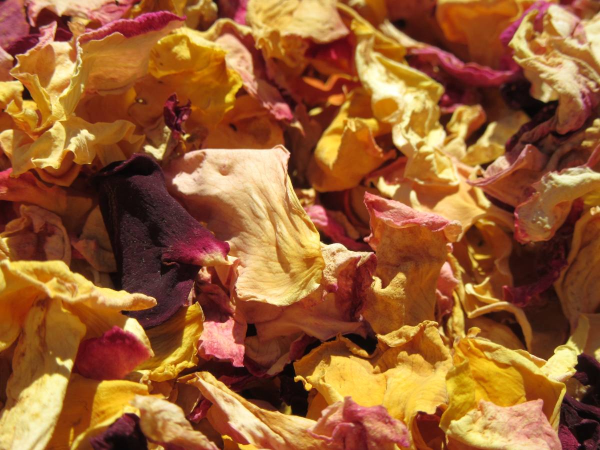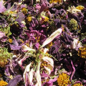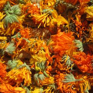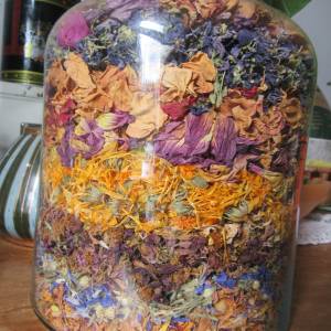 Es geht so schnell: Die Bäume sind feuerfarben, und dann ists plötzlich Winter und oft zu spät, noch Buntes in guter Qualität zu konservieren. Drum JETZT! Blüten mit heilender Wirkung oder Aromablüten oder eben einfach wunderschöne Farbtupfer, die sich gut in der Teemischung machen oder winters Desserts und Kuchen verzieren, können jetzt noch gesammelt und getrocknet werden. Je schneller die Trocknung, umso farbschonender, sofern man nicht zu heiß trocknet. Hibiskusblüten, Ringelblumenblüten, Sonnenblumen-Kranzblätter, Kornblumen, Malven, Gewürztagetes u.v.a.m. gelingen im Backofen oder im Dörrer sehr gut. Nach der Trocknung müssen sie luftdicht verschlossen aufbewahrt werden. Im Winter freut man sich über so einen Farb-Schatz!