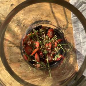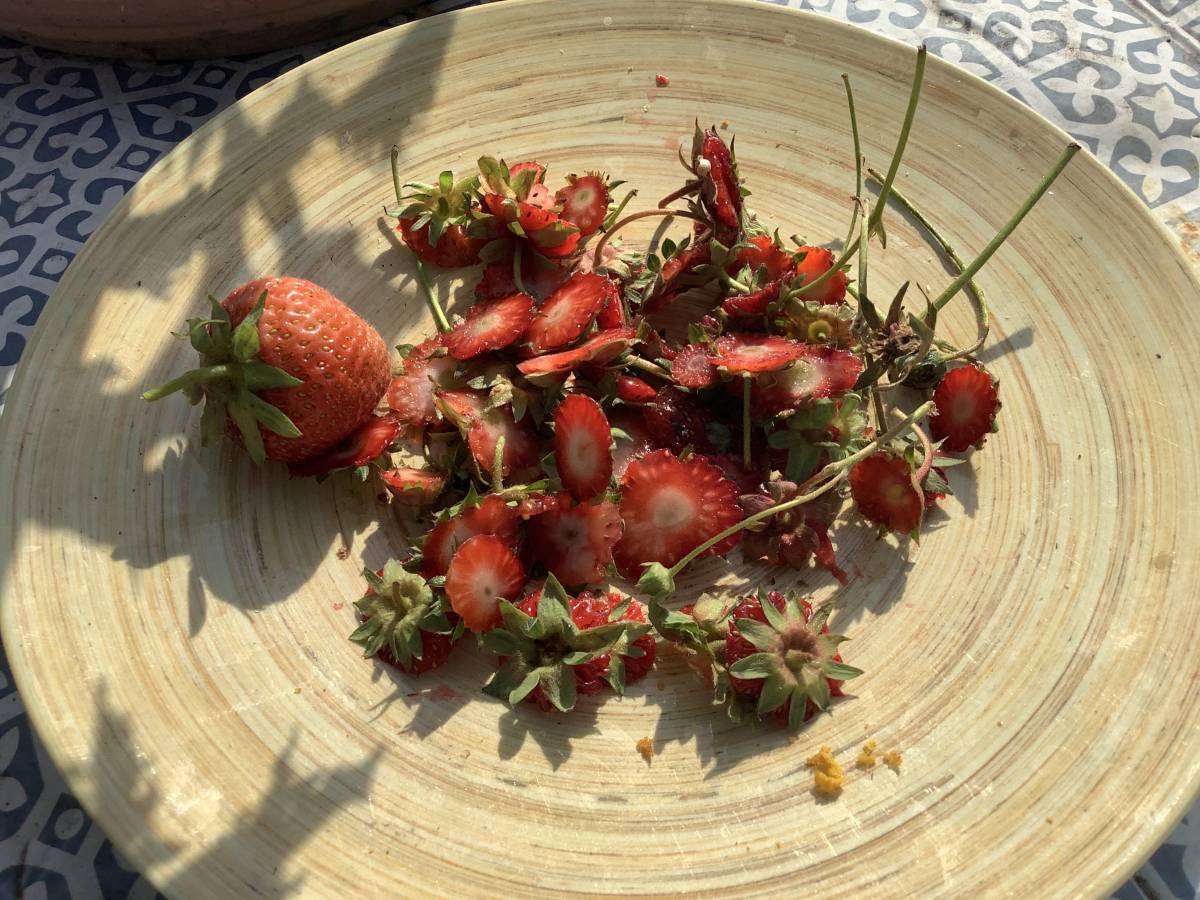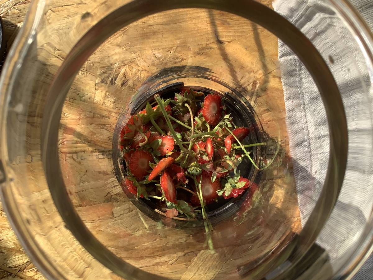 Kein Quatsch, Erdbeerstöpselchen - also das, was abgeschnitten und meist weggeworfen wird - sind nicht nur verwendbar, sondern sie enthalten mehr Gutes als die ganze Erdbeere. Das Häuflein, das entsteht, wenn man 300 g Erdbeeren verzehrfertig macht, reicht für eine ganze Kanne Tee. Richtig: aufgiessen, schön lang ziehen lassen, und sofort oder kaltgestellt später trinken, leckerer Früchteteegeschmack. Natürlich kann man die Stöpsel auch dranlassen und mitessen... Gewusst?